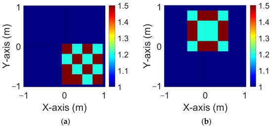 where represents each incident wave, while correspond to the dielectric coefficient distributions derived through back-propagation. By applying the least squares method to all incident cases in Equation (31), we can derive the analytical solution for the n-th element of the contrast .