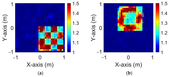 Figure 13a,b show the original and dielectric coefficient distributions of the object with 5% noise. Figure 14a,b present the and distributions reconstructed by the GAN with 5% noise. The results in Figure 14 indicate that the general shape of the dielectric distribution is recognizable. Figure 15a,b display the TE and TM distributions reconstructed by GAN with SA under 5% noise. The reconstructions in Figure 15 demonstrate that the image is clearly identifiable based on the permittivity distribution. More importantly, it closely resembles the original permittivity distribution. The corresponding RMSE and SSIM values are summarized in Table 4, which clearly shows that the GAN with SA provides better reconstruction performance than the GAN.