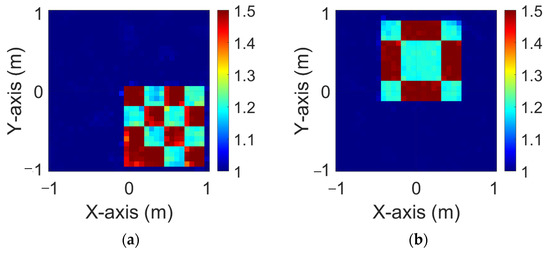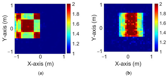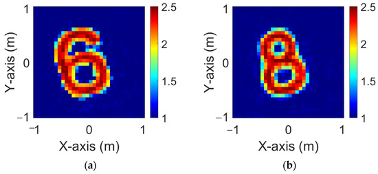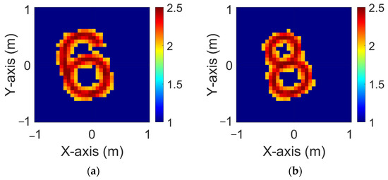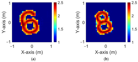 Figure 10a,b illustrate the ground truth distributions of the dielectric coefficients under and polarizations, respectively, with 5% Gaussian noise added. In Figure 11a,b, the corresponding and reconstructions generated by the standard GAN model under the same noise conditions are shown. As observed in Figure 11, the reconstructed dielectric profiles tend to be blurry and lack structural clarity. In contrast, Figure 12a,b present the reconstruction results obtained using the proposed GAN with SA approach, again under 5% noise, for both and cases. The reconstructions in Figure 12 are noticeably clearer than those in Figure 11. The corresponding RMSE and SSIM values are summarized in Table 3, which clearly shows that the GAN with SA mechanism provides better reconstruction performance than the GAN.