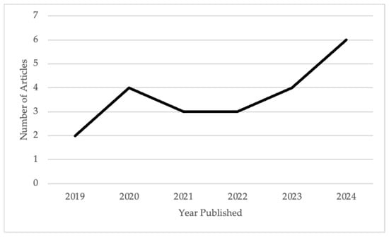 While the literature search included all possible publication dates, the 22 records included in this review were published between 2019 and 2024 (see Figure 2 for a breakdown of articles by publication year). This observation suggests that while empirical research on bus-stop shelters may have been conducted prior to 2019, the increase in peer-reviewed journal publications is a relatively recent development, indicating a growing interest and an emerging trend in this research area. It is essential to acknowledge that earlier research can be found in book chapters, conference papers, and reports, further enriching the overall knowledge base focusing on bus-stop design. However, we specifically chose to only include peer-reviewed journal articles in this review as a way to control quality and research rigor.