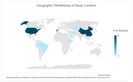 The reviewed publications are geographically diverse, with ten articles reporting research conducted in Asia (four from China, two from South Korea, and one each from Singapore, Japan, Kazakhstan, and Iran). Six articles reported research completed in Southwestern Europe, including three from Portugal, two from Spain, and one from the UK. Four articles involved research from North America, specifically, the United States, with studies taking place in Texas, Arizona, Tennessee, and Utah. Additionally, one article reported on research from South America (Brazil) and one from Africa (Ethiopia). Figure 3 shows the geographic distribution of the study locations, mapped according to country. This distribution highlights a lack of studies that have taken place within the southern hemisphere, and none of the included studies were from Australia.