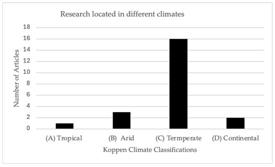 Although the studies exhibit geographic diversity, the Köppen Climate Classification, as applied to the research locations, is less varied (see Figure 4). Most research has focused on temperate regions with hot or warm summer climates. This geographical bias may explain the emphasis on bus stops in extreme weather and heat, as these regions face distinct challenges in providing comfortable and safe waiting environments for passengers. However, it also reveals potential gaps in the research conducted in climate regions other than those experiencing extreme weather and high temperatures.