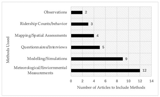 To gain insight into the various research approaches applied to bus-stop studies, we examined the methodologies reported in each article. This analysis revealed the diverse strategies employed by researchers to investigate bus-stop design, functionality, and user experiences. Out of the twenty-two articles, seventeen used solely quantitative methods, while five combined qualitative and quantitative methods. No articles relied solely on qualitative methods, indicating a strong trend toward quantitative measurements.