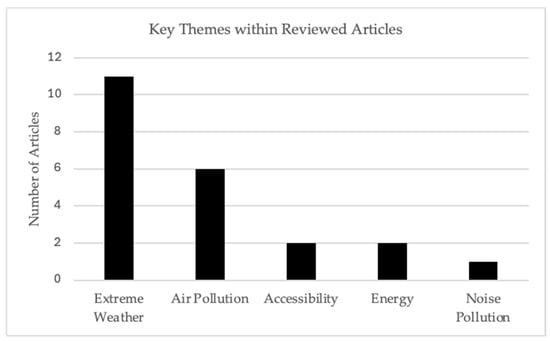The remaining articles covered a range of themes: six examined air pollution [,,,,,], two focused on accessibility [,], two explored energy-related aspects [,], and one concentrated on noise pollution []. These diverse themes emphasize the wide array of factors considered in bus-stop shelter design, underlining the importance of addressing various environmental, social, and health concerns to create optimal public transportation infrastructure. Figure 6 shows the distribution of key themes across the reviewed articles.