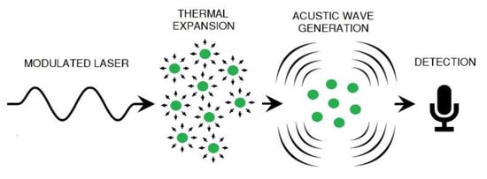 The photoacoustic effect was discovered by Alexander Graham Bell, who detected an acoustic signal by modulating a light source and causing it to impinge on a sample contained in a closed cell. It consists of the absorption of modulated light by the sample, leading to an increase in its internal energy. This energy is transferred to adjacent molecules, which are heated and undergo a process of expansion and contraction. This generates pressure variations, producing acoustic waves [16], which can be detected by sensors such as microphones. This process is illustrated in Figure 1.