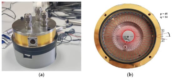 These mirrors facilitate multiple reflections, thereby increasing the optical path of the system and enhancing its advantages. The cell’s stability, attributable to its resistance to thermal expansion, surpasses that of alternative photoacoustic cell types, rendering it particularly well suited for environments where temperature control is challenging [30]. This cell’s attributes include its small size, adaptable path length, straightforward alignment, and versatility in sensing techniques. The reduction in size and volume of the cell offers significant advantages for the development of rapid and portable gas detection systems. Conventional cells typically exhibit stringent requirements regarding distance, axial flip angle, and mirror tilt to meet operational conditions. In contrast, the optical cell depicted in Figure 2 allows for straightforward modification of the optical path length by adjusting the orientation angle of the input laser beam, rendering it well suited for the analysis of gaseous species with distinct absorption lines. Although this type of cell is traditionally used for direct absorption spectroscopy, the present study proposes to use it as a circular resonator within a photoacoustic configuration. The cell is equipped with a series of gold-coated spherical mirrors in a circular configuration, integrated within a single toroidal component, thereby significantly streamlining the optical alignment procedure and ensuring superior beam shaping. The copper ring is manufactured by diamond machining (Kugler Ltd., Salem, Germany), yielding a high-quality aspheric surface suitable for optical applications due to its low roughness of a few nanometers. The surface reflectivity is enhanced by the deposition of a 200 nm thick gold layer on the surface [29].