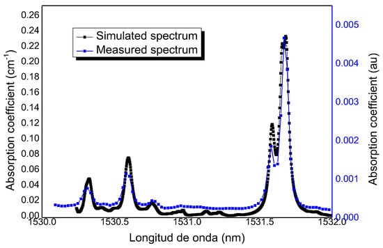 Ammonia absorption lines in the 1530 nm range. Simulated spectrum from the HITRAN database and measured by laser scanning [19].