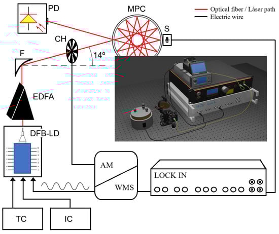 Experimental architecture MPC-PAS implemented. DFB-LD, DFB laser diode at 1532 nm; TC, temperature controller; IC, current controller; EDFA, optical amplifier; PD, reference photodetector; CH, chopper modulator; F, parabolic mirror; MPC, multipass circular cell; S, acoustic sensor; Loc-In, lock-in amplifier; AM/WMS, control, data acquisition, and processing system. 3D diagram of the implemented system.