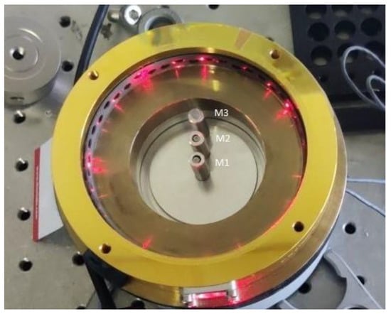 The laser beam was focused on the gas cell by a 100 mm focal length, gold-coated parabolic mirror (MPD269-M01, Thorlabs, Newton, NJ, USA). As previously described, a circular multipass cell was chosen, specifically, the IRcell-4m model from IRsweep (Stäfa, Switzerland). The IRcell-4m is an instrument designed for infrared absorption spectroscopy and offers a 4 m optical path in a compact design. It uses highly reflective mirrors on its inner walls that allow multiple reflections of the light beam, thus extending the optical path without increasing the physical size of the cell. The bottom cover of the cell underwent modification, resulting in the drilling of three holes at equal distances from the center of the cell. These perforations enabled the installation of three sensors to detect the photoacoustic signal generated within the cell. This modification also permitted the adjustment of the sensors’ height within the confines of the cell. Three identical capacitive microphones (FG-23329-P18, -53 dB, BW = 10 kHz Knowles Electronics, Itasca, IL, USA) were installed equidistantly (1 cm) from the center of the cell as shown in Figure 5. The MPC was installed on a custom-made support manufactured using a 3D printer, which facilitates straightforward installation and alignment. The top cover was outfitted with three gas inlets/outlets to regulate the concentration and flow within the cell.