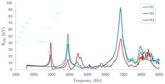 To implement the MPC-PAS system, the first step was to analyze the cell to define its resonant modes in order to maximize the photoacoustic signal generated inside the cell. These are standing waves that can be formed inside the cell due to multiple reflections of the incident light. These resonant modes are determined by the dimensions and optical properties of the cell, as well as the boundary conditions imposed by the surrounding materials. The resonant modes can have different shapes and spatial distributions depending on the cell geometry and material properties. It is important to note that the proper selection of resonant modes is crucial to optimize the performance of a resonant cell in photothermal spectroscopy. As previously stated, three capacitive microphones were installed inside the cell, spaced 1 cm apart and symmetrically positioned around the center as shown in Figure 5. The laser beam was incident inside the cell and it was modulated by a chopper (MC2000B, BW = 10 kHz, Thorlabs, Newton, NJ, USA). The modulation frequency was varied in a range from 1.5 kHz to 9 kHz with a step of 20 Hz. The results obtained for the microphones are shown in Figure 6, where three main resonance modes can be observed at approximate frequencies: 4000 Hz, 6800 Hz, and 8000 Hz.