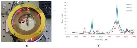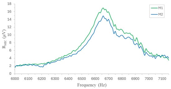 The detailed frequency response of the MPC for the M1 and M2 was determined by performing a frequency sweep from 6 kHz to 7.2 kHz, as illustrated in Figure 8, which is in close proximity to the main resonance frequency that had been determined previously, while varying the chopper modulation frequency in steps of 20 Hz. The resonance frequency (fr) of the MPC was measured to be approximately 6800 Hz, accompanied by a Q factor of approximately 32 at standard atmospheric pressure and room temperature.