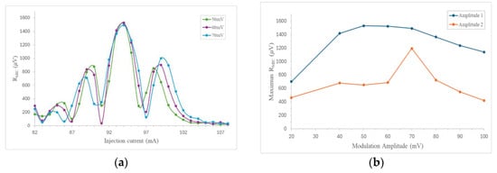 The excitation laser current was tuned to an NH3 absorption line and wavelength modulation (WMS) was implemented by directly modulating the laser using a sinusoidal signal from the lock-in amplifier with a frequency of 3400 Hz, which is half the frequency of the main resonant mode (fr/2). This signal was connected to the laser driver, which allowed for an external modulation connection with a modulation coefficient of 150 mA/V. Subsequently, the acquired signal was demodulated in the second harmonic using the lock-in amplifier, thus performing 2f-WMS detection. The modulation amplitude was varied in a range between 20 mV and 100 mV to find the optimal amplitude that maximizes the central peak value and obtains the best spectral response. Figure 9a shows the detected spectra of the 2f-WMS signal for three different amplitudes, while Figure 9b shows the amplitude value for the central peak (Amplitude 1) and the difference between the main peak and the first peak on the left (Amplitude 2) for 10 different amplitude values. In this way, the optimal modulation amplitude was identified as 60 mV [34].