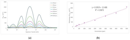 As mentioned above, starting from the certified concentration of 5000 ppm NH3:N2, different concentrations of NH3 were obtained, from 200 ppm to 5000 ppm, using a gas mixer and maintaining a constant flow throughout the measurement of 60 mlm. For each concentration, several spectral sweeps of the NH3 absorption line were recorded. Representative 2f-MPC-PAS scans are shown in Figure 10a. The average peak signal values were plotted against NH3 concentration. The data set together with the best linear fit, representing the calibration curve of the NH3 sensor, is shown in Figure 10b. A coefficient of determination (R2) of 0.987 is obtained, confirming the linearity of the sensor over this range.