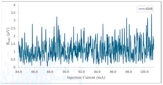 Finally, to estimate the noise, a laser wavelength sweep was performed in the measurement range between 84.9 and 103 mA, as shown in Figure 11. The noise level was determined from the signal obtained with the gas cell filled with N2 only. This signal was taken every second for 60 s. The data set was then analyzed, and the standard deviation of the noise sample (1σ) was determined to be 5.36 × 10−7 V. The minimum detection limit (SNR = 1), taking into account the standard deviation of the noise (1σ), was estimated at 770 ppb, using the ratio between the standard deviation of the background noise and the sensitivity of the system (slope of the calibration curve in Figure 10b). Consequently, the corresponding normalized equivalent absorption coefficient (NNEA) for NH3 was 1.07 × 10−8 W cm−1 Hz−1/2, obtained with a bandwidth of 0.26 Hz (for a time constant of 0.3 s) and an effective power of 30 mW, which was calculated by considering the ratio between the incident power and the output power measured by the reference photodetector.