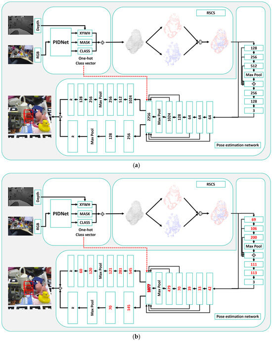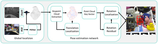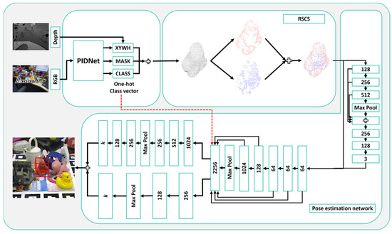 We fine-tuned the PIDNet architecture [28], which was pre-trained on ImageNet [39], to obtain mask images for different categories of target objects. Point cloud keypoints were extracted from RGB-D data using the RSCS method and used for pose estimation. We then trained our improved pose estimation network based on G2L-Net [27]. The network architecture is illustrated in Figure 2.