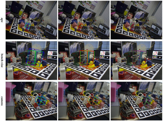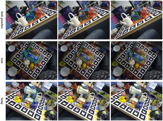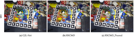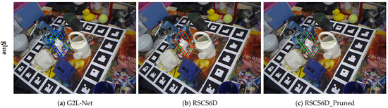 In this study, 3D bounding-box visualization assesses various algorithms’ pose estimation performance. The process involves generating a reference bounding box from the target object’s 3D model, computing a predicted-pose bounding box using the algorithm-estimated rotation matrix and translation vector, and projecting it into 2D image space for comparison. On the LineMod dataset (Figure 4, Figure 5 and Figure 6), green, blue, red, and purple boxes denote the ground-truth pose and predictions from G2L-Net, RSCS6D, and RSCS6D_Pruned algorithms. Results show our point-cloud-keypoint-based DL pose estimation algorithm outperforms the G2L-Net baseline. Both the original and quantized versions achieve higher positioning accuracy than the contrast algorithm, with the quantized version performing slightly better.