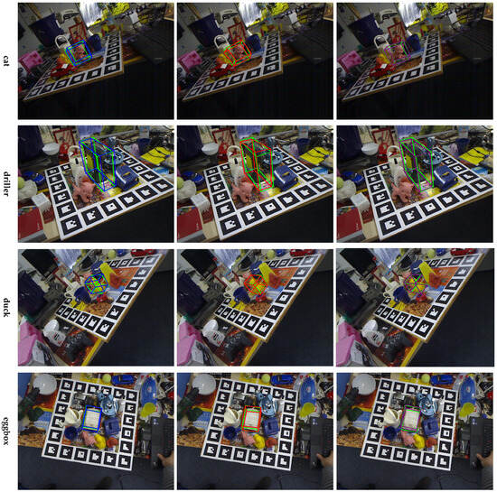 The LineMod dataset [41] comprises 15,783 images featuring 13 objects, each with approximately 1000 images. Most objects are textureless, and the dataset includes complex scenes with varying lighting conditions, posing significant challenges for pose estimation. Unlike the YCB dataset, which organizes data by scenes, LineMod is organized by objects. Each object’s folder contains depth maps, segmentation masks, RGB images, and text files with pose and annotation information, as well as camera intrinsics and depth scaling factors. LineMod focuses on single-object information; for example, the folder for the first object provides its segmentation masks, pose, and annotations, but not for other objects. Additionally, the dataset provides 3D models of the 13 objects in ply format.