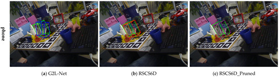 Visualization of Results I. The green, blue, red, and purple boxes denote the ground truth pose and the predicted poses from the G2L-Net, RSCS6D, and RSCS6D_Pruned algorithms.