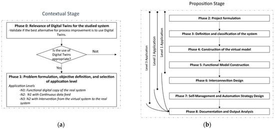 The proposed methodology consists of two sequential stages: the contextual stage defines the system’s suitability for DT implementation by establishing objectives, KPIs, and technical requirements; the propositional stage involves the design, modeling, and integration of the DT based on those parameters, enabling decision support and performance evaluation.