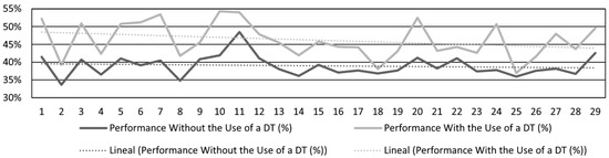 To evaluate the impact of the DT implementation on process efficiency, a structured and sustained data collection process was conducted. In this context, “Process Efficiency” refers to the amount of stable compost produced per unit of raw organic material over a defined period, accounting for factors such as moisture optimization and accelerated transformation rates. Over a period of 29 consecutive weeks, trained personnel recorded four measurements per day, Monday through Friday, targeting key variables such as internal pile temperature, humidity, and material transformation indicators. This schedule, aligned with the facility’s operational availability, allowed the capture of diurnal variation and gradual trends without disrupting daily workflows. The volume and temporal resolution of the resulting dataset provided sufficient statistical power for rigorous analysis. A one-way analysis of variance (ANOVA) was performed to compare the mean efficiency before and after the deployment of the DTs. The null hypothesis (H0) stated that no significant difference would be observed between both conditions, while the alternative hypothesis (H1) posited that the DTs would produce a measurable improvement. The results yielded high statistical significance (p < 0.001), confirming that the implementation led to a notable increase in average efficiency. Additionally, the Levene test showed a significant reduction in performance variability (p < 0.01), indicating that the process became more consistent and stable. These findings validate not only the effectiveness but also the robustness and reliability of the methodology under real-world operational conditions.