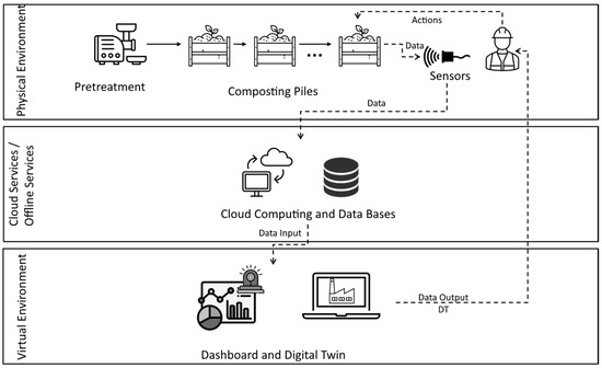 Figure 6). The physical environment includes composting piles and operators, which are monitored using low-cost sensors. Data is acquired via microcontrollers and transmitted to a cloud-based processing layer using wireless protocols. The virtual environment receives real-time data for simulation and decision support, while visualization dashboards enable human-in-the-loop supervision. Operational feedback is then applied manually or automatically, closing the control loop and enabling continuous optimization under real-world conditions.