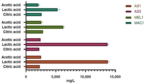 - Bangar, S.P.; Suri, S.; Trif, M.; Ozogul, F. Organic acids production from lactic acid bacteria: A preservation approach. Food Biosci. 2022, 46, 101615. [Google Scholar] [CrossRef]
