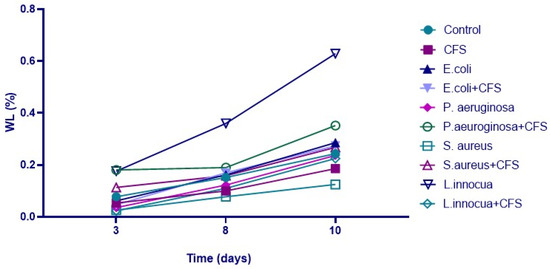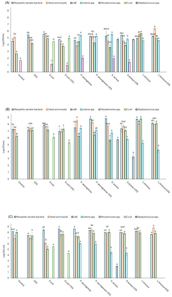 | L. innocua+CFS | 3 | 47.37 ± 1.62ab | −2.47 ± 0.77 | 28.10 ± 1.75abcd | 5.03 ± 6.90 |