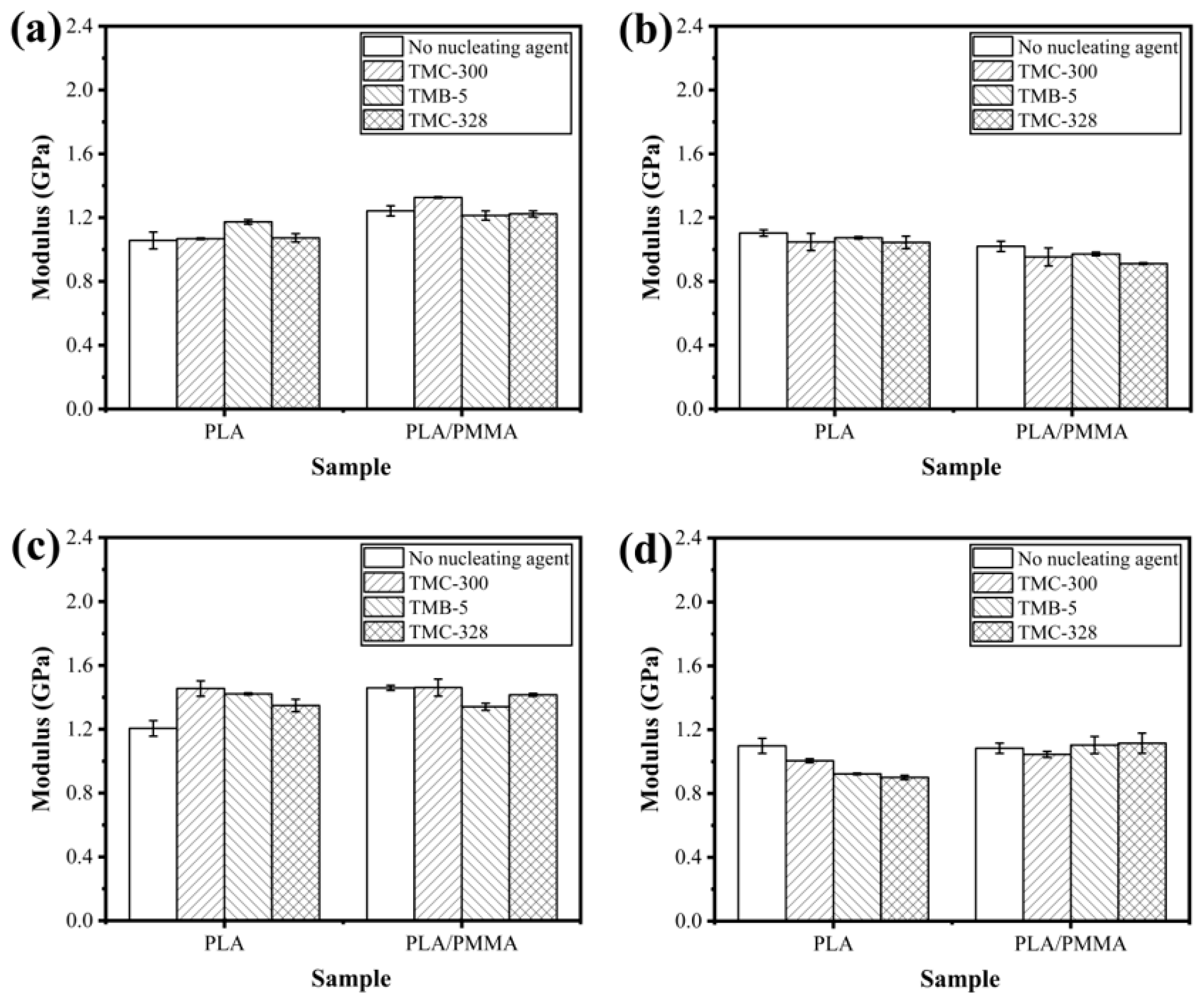 Although adding the TMC-300 nucleating agent to the PLA system at 90 °C during isothermal crystallization decreased the crystallization rate, it increased the crystallinity. Conversely, TMC-328 addition increased the crystallization rate but reduced the crystallinity. However, the addition of TMB-5 decreased the crystallization rate and crystallinity. This discrepancy was attributed to the fact that PLA crystallization was influenced by both nucleation and grain growth. The granular shape of the TMC-300 nucleating agent differed from TMB-5 and TMC-328 [22,23,24], causing variation in the number of nucleation sites. In these conditions, the influence of the nucleation sites on crystallinity outweighs the effect on grain growth. Even though a faster nucleation rate was evident during the later stages of grain growth, a longer crystallization time reduced the number of available nucleation sites, decreasing the PLA crystallinity.