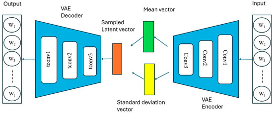 The encoder compresses the input data into a latent space representation. It consists of a sequence of convolutional layers for hierarchical feature extraction, batch normalization for stable training, and Leaky ReLU [31] activation functions for computational efficiency. The encoder extracts high-level features while retaining temporal dependencies critical for detecting subtle anomalies in V2X data. After the convolutional layers, the latent space is represented by two vectors, the mean () and the log variance (log ), which are used for sampling the latent vector via the reparameterization approach. This step ensures smooth latent space representations, allowing for gradient-based optimization.