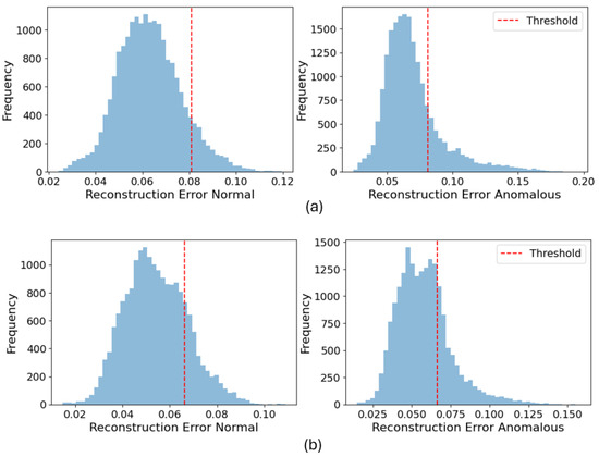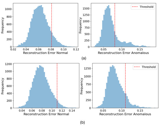 The reconstruction error distributions in Figure 3 and Figure 4 visually affirm the model’s discriminative power. Our VAE-CNN demonstrated a more precise separation between the reconstruction errors of normal and anomalous samples compared to the VAE-LSTM and traditional autoencoder, particularly for vehicle-targeted offsets. This clear distinction is crucial for setting an effective detection threshold that balances high recall with acceptable precision, as targeted by our 98th percentile thresholding strategy.