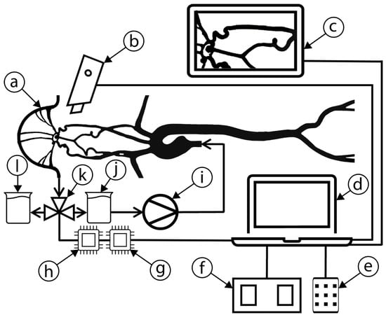 AngioSim setup. (a) Vascular silicone simulator; (b) camera; (c) screen; (d) notebook; (e) numeric keypad; (f) footswitch; (g) USB-to-GPIO adapter; (h) relay; (i) pulsatile pump; (j) water reservoir; (k) solenoid valve; (l) wastewater reservoir. Lines with arrowheads indicate fluid flow direction. Lines without arrowheads indicate data interfaces.