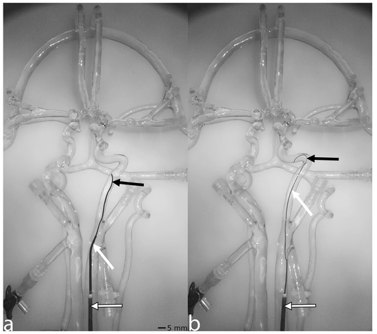 Fluoroscopy mode. The left panel (a) displays a balloon catheter, marked by a white arrow with black borders, along with a guiding catheter and guide wire, indicated by a white arrow and a black arrow, respectively, positioned within the left carotid artery. The right panel (b) shows a balloon catheter, also marked by a white arrow with black borders, alongside a microcatheter and microwire, indicated by a white arrow and a black arrow, respectively.