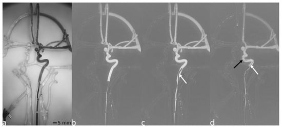 AngioSim’s RM mode mimics the roadmap generation process of a real angiography unit, enhancing vascular visualization. When ‘Cine’ is pressed, a subtraction mask is generated by accumulating all recorded frames until ‘Cine’ is released. The accumulation is achieved by taking the minimum intensity of each pixel across frames to enhance vessel visibility under contrast agent injection, providing a clear image of the contrasted vessels. The mask generation is displayed in real time to guide the procedure, as illustrated in Figure 3a, which shows an accumulated RM mask. When a mask is successfully captured, pressing ‘X-ray’ subtracts the mask from the live image to reveal the contrasted vascular structures, as shown in Figure 3b. Figure 3c,d show how the RM mode highlights changes in the image, such as the movement of catheters and wires. Additional image processing, including brightness adjustments, is applied to further refine the RM image.