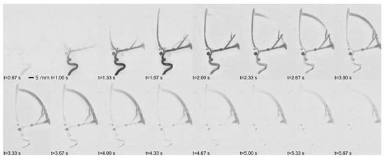Digital subtraction angiography (DSA) simulation. The visualization of contrasted vessels over time during a simulated DSA using AngioSim. The images show the progression of contrast agent flow through the vascular structures, captured at intervals of 0.33 s, from t = 0.67 s to t = 5.67 s. At t = 0.67 s, the first appearance of the contrast agent is visible.