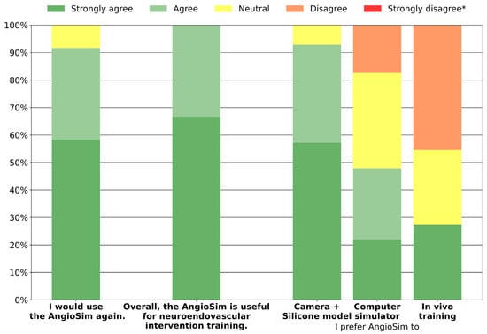 Physicians’ ratings on their preferences and the perceived usefulness of various training options. The evaluations include their willingness to use AngioSim again, its usefulness for neuroendovascular intervention training, and preferences for AngioSim over camera-based silicone models, computer simulators, and in vivo training. Responses are categorized from “Strongly Agree” to “Strongly Disagree”. * “Strongly Disagree” was included in the questionnaire but was not selected by any respondents.