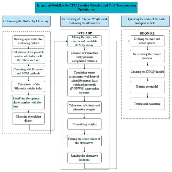 As a result, this study proposes a hybrid approach to evaluate ATM locations and plan vehicle routing between these locations to provide the most reliable transportation operations for the CIT process. One of the research topics of this study is the ATM location selection problem and which criteria should be considered in ATM location selection. Another topic is the route optimization of cash transportation vehicles. A real-life study is conducted in Istanbul, the most populous city of Turkey, to demonstrate the procedure for solving ATM location selection and vehicle routing problems. Therefore, the problem is initially modeled as a decision-making problem and the criteria are established based on literature review and expert opinions. Clustering approaches determine the high-risk district and then determine the most suitable location according to the weights obtained by the IVFF-AHP method. The most suitable location is determined by the clustering approaches according to the weights determined by the IVFF-AHP method. According to the clustering approach, the riskiest district of Istanbul is selected as Esenyurt, and the most suitable ATM location in this district is determined. Of the four main criteria for location selection, the most important one is “demographic”, and the least important one is “commercial and financial”. In the decision-making research for Istanbul, Esenyurt Hospital was determined to be the most suitable location, with a final score of 0.27. This alternative is followed by Hotel Sheraton Esenyurt, with a final score of 0.26. When the main and sub-criteria are considered and more than one expert evaluates the final findings, the Esenyurt Hospital location, which ranks first in terms of low traffic density, high population density, and security, seems quite reasonable. Besides optimizing ATM placement, the proposed methodology also enables CIT vehicle routing using DDQN-RL. A dynamic routing system is developed by integrating real traffic data into the route optimization of the located ATMs to improve operation efficiency. Unlike traditional vehicle routing methods, the proposed DDQN-RL model enables the CIT vehicle to adapt to demand changes, traffic fluctuations, and ATM network changes, thus providing service with minimum cost and delay. This study contributes to the literature on location selection decision-making problems. The contributions of this study to the literature are as follows: (i) The most detailed criteria structure was developed to analyze alternative ATM locations, considering the risks associated with CIT operations; (ii) In this study, the IVFF-AHP method was used for the first time in the ATM location selection problem; (iii) For the first time in the literature, a clustering approach was integrated into the IVFF-AHP methodology to limit and prioritize the district to be selected for ATM locations; (iv) The location selection was furthered by applying the DDQN-RL model using real traffic data to make the cash transportation procedure more efficient; (v) In order to demonstrate the applicability of the proposed hybrid methodology, four alternatives were tested in Istanbul, and the optimum route was selected for the alternatives.