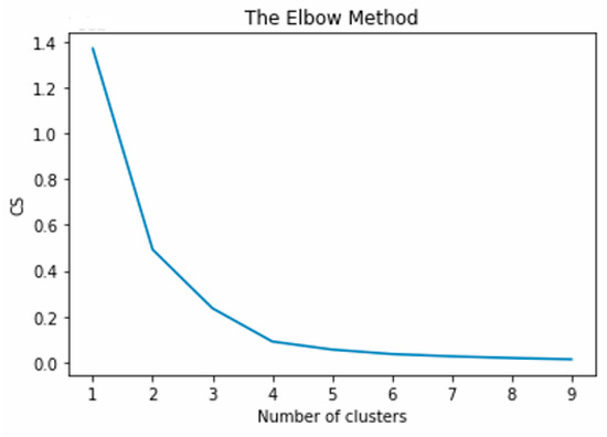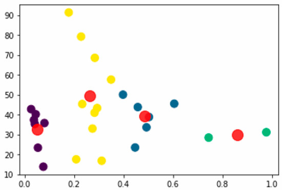 In the K-means algorithm, one of the most common clustering methods, the data is divided into k-data groups by including each data point in the cluster with the closest mean [25]. First, the k centroids of the data are calculated, and in the next step, each data point is directed from the relevant data point to the cluster with the nearest centroid. Different distance metrics are used while finding the closest centroid; the most widely used method is the Euclidean distance. After clustering, the center of gravity of each cluster is recalculated. Considering this center, the new Euclidean distance between each data point and the center is calculated, and the points with the minimum Euclidean distance in the clusters are determined. Each cluster is defined together with the data in the cluster and its centroid. The centroid of each cluster is the point where the sum of the distances to all the data in the related cluster is minimized. In this case, K-means can be defined as an iterative and non-hierarchical algorithm in which the sum of the distances of the data in the cluster from the cluster center is minimized for each cluster. The minimum square error can stop the algorithm, or the optimum set can be determined by trial and error.