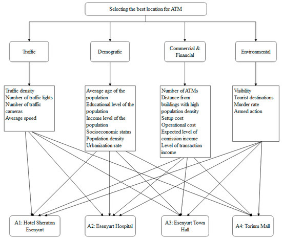 Several studies have utilized decision trees, clustering algorithms, and statistical models to determine optimal ATM locations based on criteria such as population density, competition, or rent costs [9,10,11]. Since the ATM location decision has criteria that can be measured or expressed with subjective evaluations, it has also been the subject of studies on multi-criteria decision-making (MCDM) methods. Genevois et al. determined the quantitative and qualitative criteria to be considered in ATM site selection and obtained the importance levels of these criteria with the Analytic Network Process (ANP). According to the results of the study, while the most important criterion in the selection of the place is the salary payment point, it is observed that the average age of the population, the number of credit cards from other banks, the salary amount, and the number of employees in the company do not affect the selection [12]. Shahhoseini and Attari proposed a new model consisting of the fuzzy AHP and fuzzy ELECTRE III to find the optimal location for newly installed ATMs. Fuzzy AHP was used to find the criterion weights in the model, and the most important criterion was available ATM locations, including competing banks. A ranking of alternative ATM locations was obtained with ELECTRE III [13].
