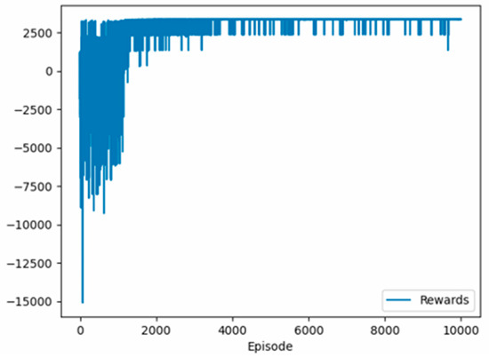 During training, the distance matrix remained fixed, reflecting the traffic-adjusted travel costs for the designated operational period. The model was trained for 10,000 episodes, ensuring robust convergence of the Q-values. The epsilon-greedy strategy was used to balance exploration and exploitation, with an initial exploration rate of ε = 0.7 that gradually decayed to ε = 0.01. The final trained model successfully demonstrated optimal ATM servicing strategies, effectively minimizing total travel distance, maximizing vehicle utilization, and dynamically responding to operational changes in real-world deployment scenarios.