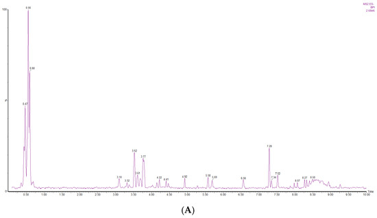The analysis of amino acids in Filipendula extracts was performed using an Acquity H-class UPLC system (Waters, Milford, MA, USA) coupled with a Xevo TQD mass spectrometer (Waters, Milford, MA, USA). A 1 µL sample of extracts was injected into a BEH Amide column (150 mm × 2.1 mm, 1.7 µm) from Waters, with the column temperature maintained at 25 °C. The mobile phase was composed of 10 mmol ammonium formate with 0.125% formic acid as eluent A and acetonitrile as eluent B, delivered at a flow rate of 0.6 mL/min. A gradient elution method was applied as follows: 0–1 min with 95% eluent B; 1–3.9 min at 70% B; 3.9–5.1 min at 30% B; 5.1–6.4 min for flushing the column with 70% eluent A; at 6.5 min, the gradient was reset to its initial composition for a total runtime of 10 min. The mass spectrometer was operated under the following conditions: positive electrospray ionisation mode with a voltage of +3.5 kV, a cone voltage of 30 V, desolvation gas at a flow rate of 800 L/h and temperature of 400 °C, while the ion source temperature was maintained at 120 °C. Amino acid identification in the F. vulgaris extracts was achieved by comparing the retention times and MS/MS spectral data with those of analytical-grade standards [29]. Quantitative analysis was conducted using linear regression models derived from the standard dilution method [30,31].