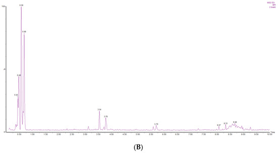 Representative chromatograms (UPLC-MS/MS) of phenolics in F. vulgaris extracts: (A) aqueous–ethanolic extract FHE1 and (B) aqueous extract FHE2.