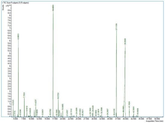 During alcohol extraction from raw materials, terpenes, and other volatile compounds were also extracted and influenced the overall pharmacological activity of the extracts. Therefore, the volatile fraction of F. vulgaris rhizomes with roots was obtained using hydrodistillation in accordance with the European Pharmacopoeia [32] and was subsequently analysed by GC-MS (Table 2 and Figure 2).