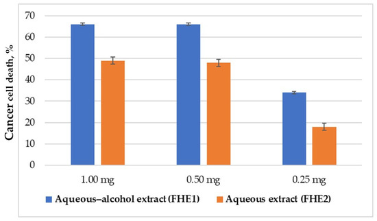 Considering the cytotoxic effect of the extracts (Figure 4), it was found that the aqueous–alcoholic extract of F. vulgaris caused death in 66% of tumour cells at a dose of 50 mg, which significantly exceeded the effectiveness of the aqueous extract (48%). This result can be explained by better extraction of such biologically active compounds as flavonoids, phenolic acids, and tannins, which promote apoptosis of cancer cells, precisely in the aqueous–alcoholic medium. The high cytotoxicity observed here correlated with the results of other studies demonstrating the effectiveness of alcohol extracts in combating tumour cells.