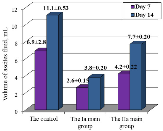 The studies were conducted in dynamics, with the determination of indicators on the 7th and 14th day. Mice were euthanised under ether anaesthesia, and ascitic fluid, blood, and carcasses of mice without intestines were taken for research. The volume of ascitic fluid was determined before and after treatment. The content of erythrocytes, leukocytes, haemoglobin, and the activity of the enzymes ceruloplasmin, catalase and iron saturation of transferrin were investigated in the blood. The content of the trace elements Fe, Cu, Zn, and Co was determined in the carcasses of mice [44,45].