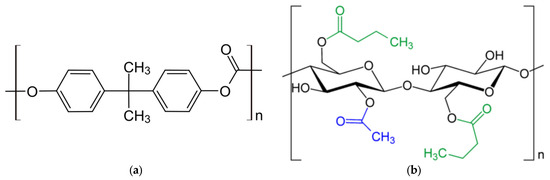 Chemical structure formula of (a) polycarbonate (PC) and (b) cellulose acetate butyrate (CAB). Images taken from [23,24], respectively. Images show simple structural formulas ineligible for copyright and therefore in public domain.
