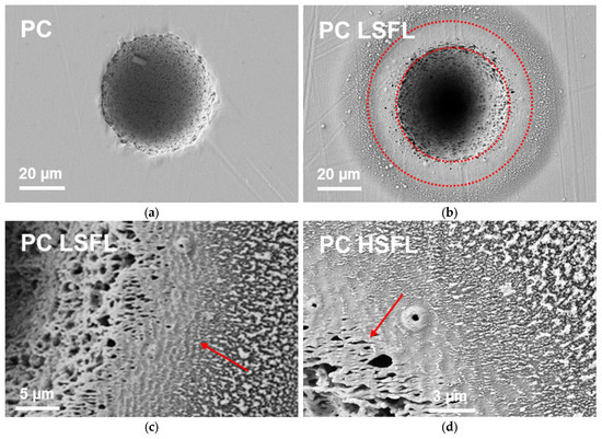 With lower laser powers (range p = 8 to 20 mW), the number of pulses was increased to compensate for the reduction in laser power (N = 500 to 1000). In this parameter range, we found that our PC samples showed laser-induced periodic surface structures (LIPSS). In some cases, both LIPSS variants (as described, for instance, in [13]) could be observed on the same sample: (1) high-spatial-frequency (HSF) LIPSS inside the crater and at the edge; (2) low-spatial-frequency (LSF) LIPSS appearing faintly in a first ring around the crater (orientated approximately perpendicular to the HSF-LIPSS), followed by a second ring of debris. In Figure 2b, the ring containing the LSF-LIPSS can be seen in between the two added red circles. For p = 11 mW and N = 500, a similar result was observed.