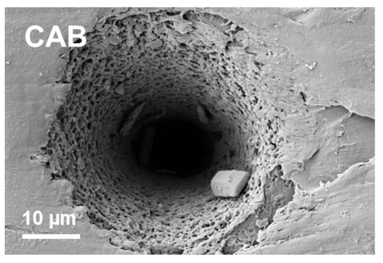 SEM images of the inside of a single-burst crater on extruded CAB with p = 16 mW, f = 0.5 kHz, N = 750 and F0 = 1.34 J/cm2. The larger (rectangular) particles inside the crater in the image probably originate from redeposited material (i.e., debris).
