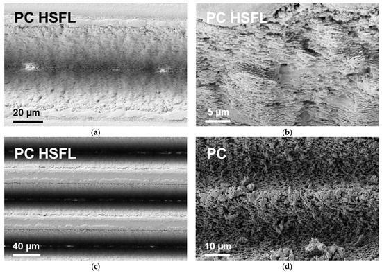 SEM images of laser-written lines on PC: (a) multiple-overscan line with p = 9 mW, f = 0.5 kHz, vscan = 2000 µm/s, Nline = 18.75, #os = 100 and F0 = 0.75 J/cm2; (b) detail of multiple-overscan line with p = 8 mW, f = 0.5 kHz, vscan = 2000 µm/s, Nline = 18.75, #os = 100 and F0 = 0.67 J/cm2; (c) multiple-overscan lines (ΔS = 70 µm) with p = 9 mW, f = 0.5 kHz, vscan = 2000 µm/s, Nline = 18.75, #os = 100 and F0 = 0.75 J/cm2; (d) single lines (ΔS = 20 µm) with p = 24 mW, f = 2 kHz, vscan = 1000 µm/s, Nline = 150, #os = 1 and F0 = 0.50 J/cm2. Bright areas at bottom of lines in image (a,c) probably originate from charging during SEM investigation. All lines written in x-direction.