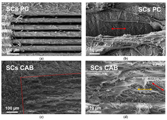 Figure 7c shows an overview for pure CAB. The cell coverage on this sample is so high that the structured areas are difficult to find. To make it clear where the structured area is in Figure 7c, red lines are added. These red lines indicate the edges of the structured area. The cells outside of the red marks show no directional growth, whereas inside they show alignment along the laser-structured lines. With a closer look, it is also possible to see the irregular, sponge-like structure in between the cells of the not-so-densely cell-covered area in the valleys between the lines. The cells show a tendency to stay at the top section of the lines. The spacing of the lines with ΔS = 55 µm was chosen so that a small bridge of unstructured surface remained in between the laser-written lines. The cells seem to stack on top of this small bridge. Some of them also attach to the sidewall or even grow across the laser-written line to the other sidewall. Figure 7d shows a more detailed SEM image. The main directions of the cell protrusions (marked by the orange and red arrows) seem to react to the irregular, sponge-like structure by growing in a similar, but not identical direction, which is indicated by the red arrow. This means the nanostructures may add to the alignment of the Schwann cells of this sample to a certain degree. But the microstructure, the lines themselves and especially the unstructured small bridges between them, seems to play the major role in the alignment process of the cells.