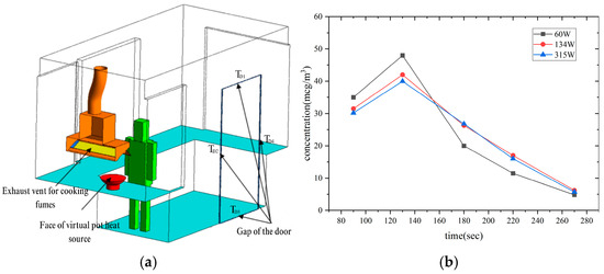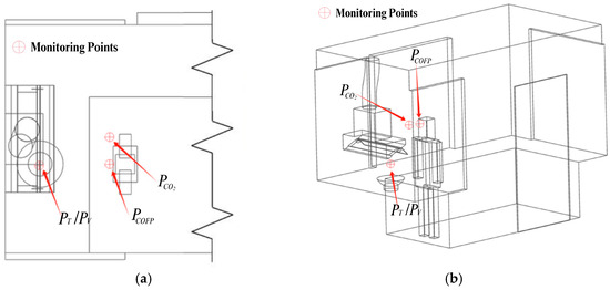 Kitchen Test Scenarios. (a) Monitoring point for pollutants and airflow pattern; (b) 3D layout of monitoring points.
